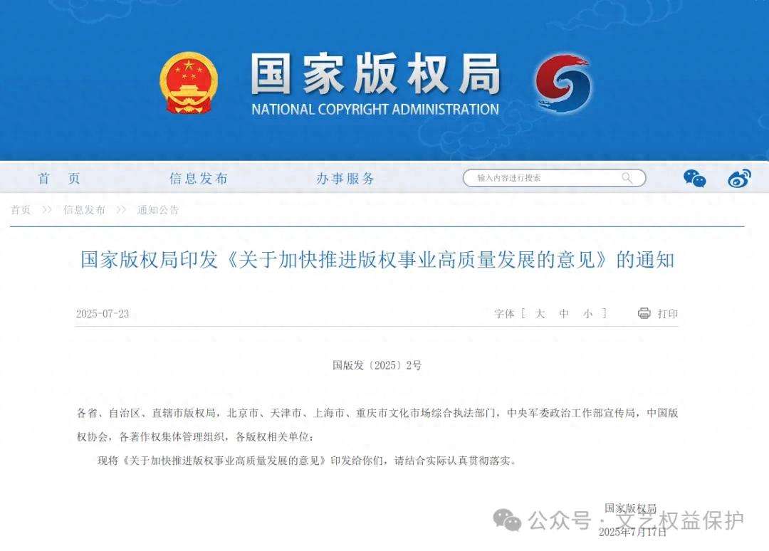 近日,國家版權局印發《關于加快推進版權事業高質量發展的意見》(以下簡稱《意見》),自2025年7月17日起施行。《意見》堅持以習近平新時代中國特色社會主義思想為指導,全面貫徹落實黨的二十大和二十屆二中、三...